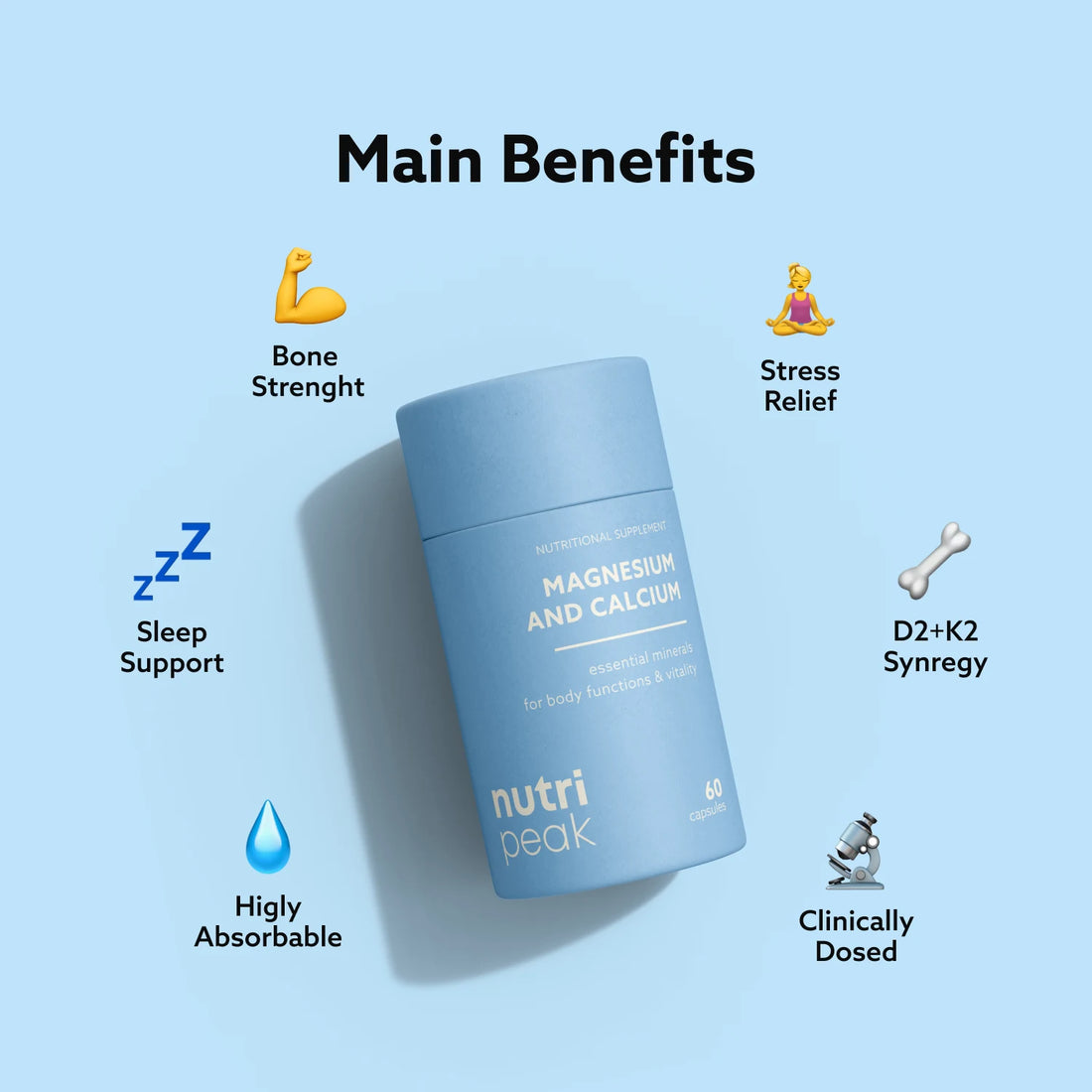 Nutripeak MG & CA is built with highly bioavailable forms of magnesium, calcium, and vitamin D3, clinically studied to support bone density, muscle function, and nerve health.